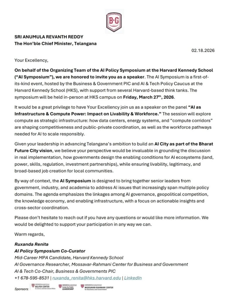 హార్వర్డ్ నుంచి సీఎం రేవంత్ రెడ్డికి అరుదైన ఆహ్వానం ముఖ్యమంత్రి ఎ.రేవంత్ రెడ్డి అమెరికాలోని హార్వర్డ్ కెన్నెడీ స్కూల్ అరుదైన ఆహ్వానం అందింది. హార్వర్డ్ కెన్నెడీ స్కూల్ తొలిసారిగా నిర్వహిస్తున్న ఏఐ పాలసీ సింపోజియంలో ప్రసంగించాలని నిర్వాహకులు ఆహ్వాన లేఖను పంపించారు. ఈ ఏడాది మార్చి 27న హార్వర్డ్ స్కూల్ క్యాంపస్లోనే ఈ కార్యక్రమం జరుగనుంది. భారత్ నుంచి తెలంగాణ ముఖ్యమంత్రి ఒక్కరే ఈ సింపోజియం ఆహ్వానం అందుకోవటం విశేషం.