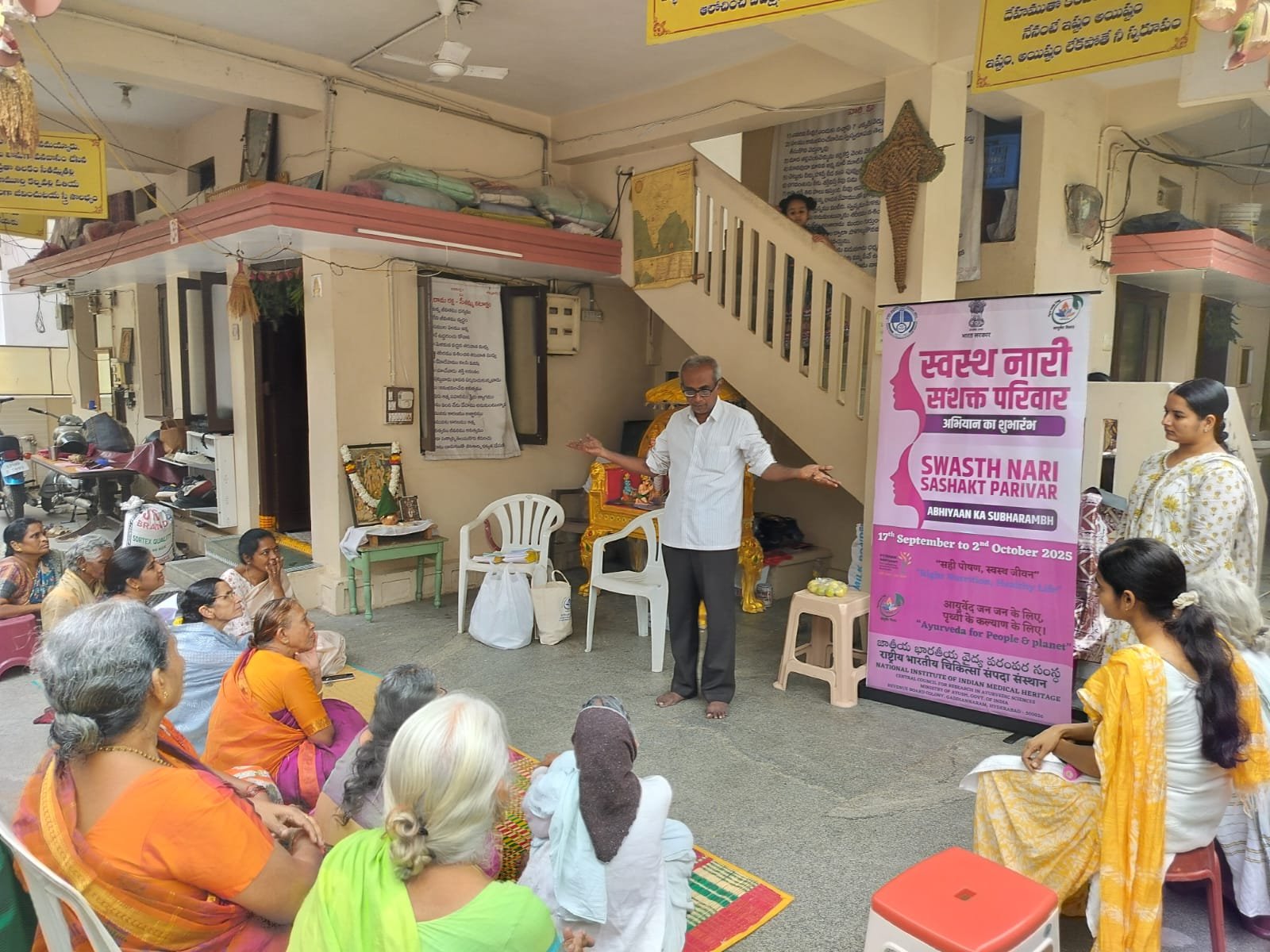 హైదరాబాద్, సెప్టెంబర్ 25 : ఇంట్లో మహిళ ఆరోగ్యంగా ఉంటె కుటుంబం మొత్తం ఆరోగ్యంగానూ, సంతోషంగానూ ఉంటుందని N.I.I.M.H. అసిస్టెంట్ డైరెక్టర్ డాక్టర్ వి. సుభాష్ చెప్పారు. ఆయుష్ మంత్రిత్వ శాఖ లోని కేంద్రీయ ఆయుర్వేద విజ్ఞాన పరిశోధన పరిషత్తు కు చెందిన నేషనల్ ఇనిస్ట్యూట్ ఆఫ్ ఇండియన్ మెడికల్ హెరిటేజ్ సెప్టెంబర్ 25 న గడ్డిఅన్నారంలోని APAU కాలనీలోని ధర్మ నిలయంలో నిర్వహించిన కార్యక్రమంలో ఆయన ప్రసంగించారు. ఆరోగ్యకరమైన మహిళలు – సాధికారత కుటుంబ ప్రచారం అనే అంశంపై సభను నిర్వహించారు.