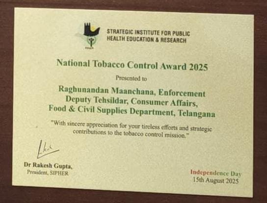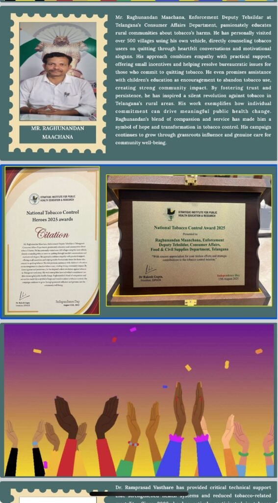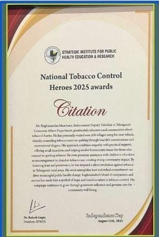 మాచన రఘునందన్ అనే పేరు ఇకపై ఒక అధికారి పేరు మాత్రమే కాదు, పొగాకు మహమ్మారికి వ్యతిరేకంగా పోరాడిన ఒక విప్లవ వీరుడి పేరు. ఆయన పొందిన “హీరో” అవార్డు కేవలం ఒక బహుమతి కాదు, నిస్వార్థ సేవకు లభించిన కిరీటం. ఆయన జీవితం, రేపటి తరం కోసం ఒక ఆదర్శం, ప్రేరణ.