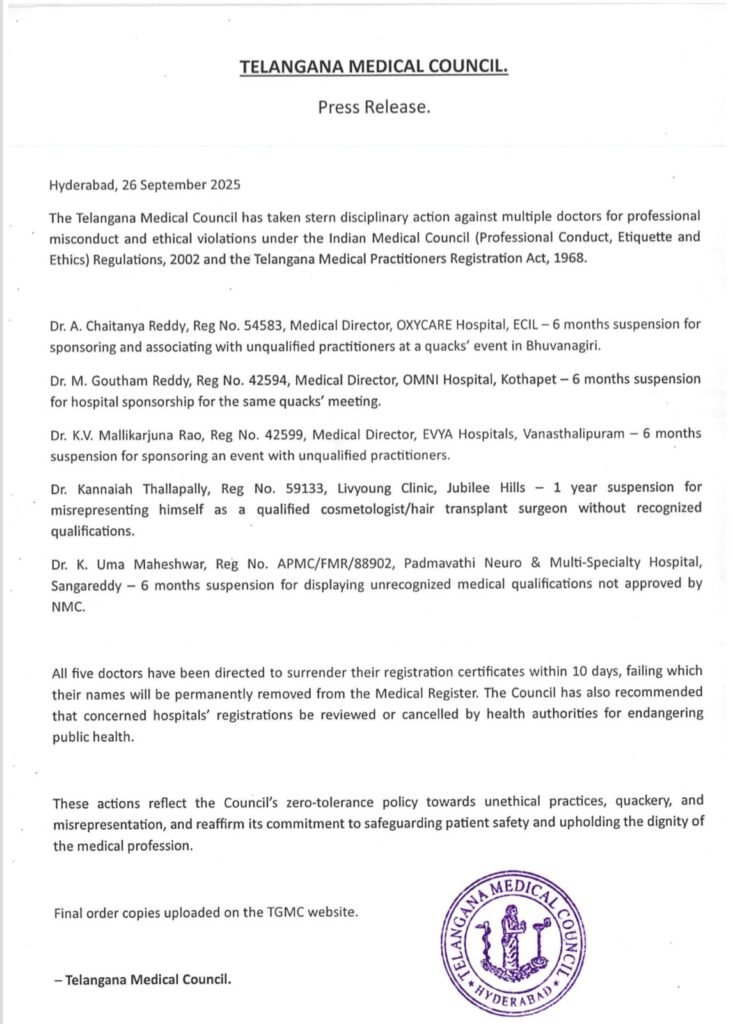 ఈ మేరకు తెలంగాణ మెడికల్ కౌన్సిల్ ఒక ప్రకటన విడుదల చేసింది.
