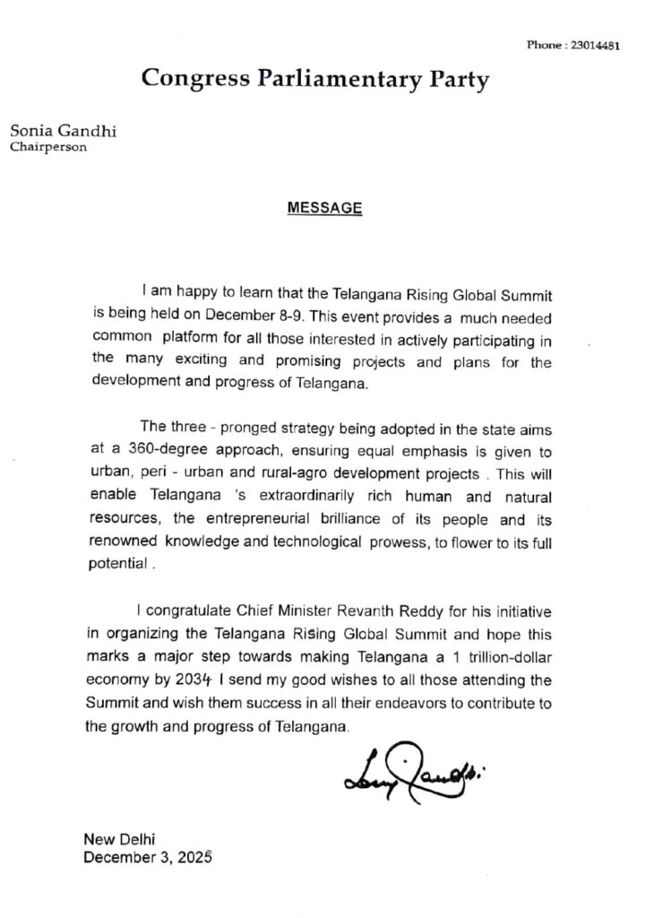 తెలంగాణ రైజింగ్ గ్లోబ‌ల్ స‌మ్మిట్ నిర్వ‌హిస్తున్నందుకు ముఖ్యమంత్రి రేవంత్ రెడ్డికి సోనియా గాంధీ అభినంద‌న‌లు తెలిపారు. రాష్ట్ర అభివృద్ధికి సీఎం చేస్తున్న కృషి విజయవంతం కావాలని ఆమె ఆకాంక్షించారు.