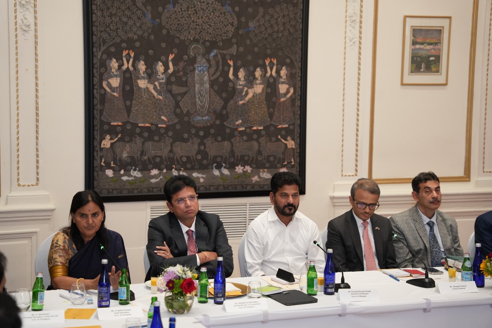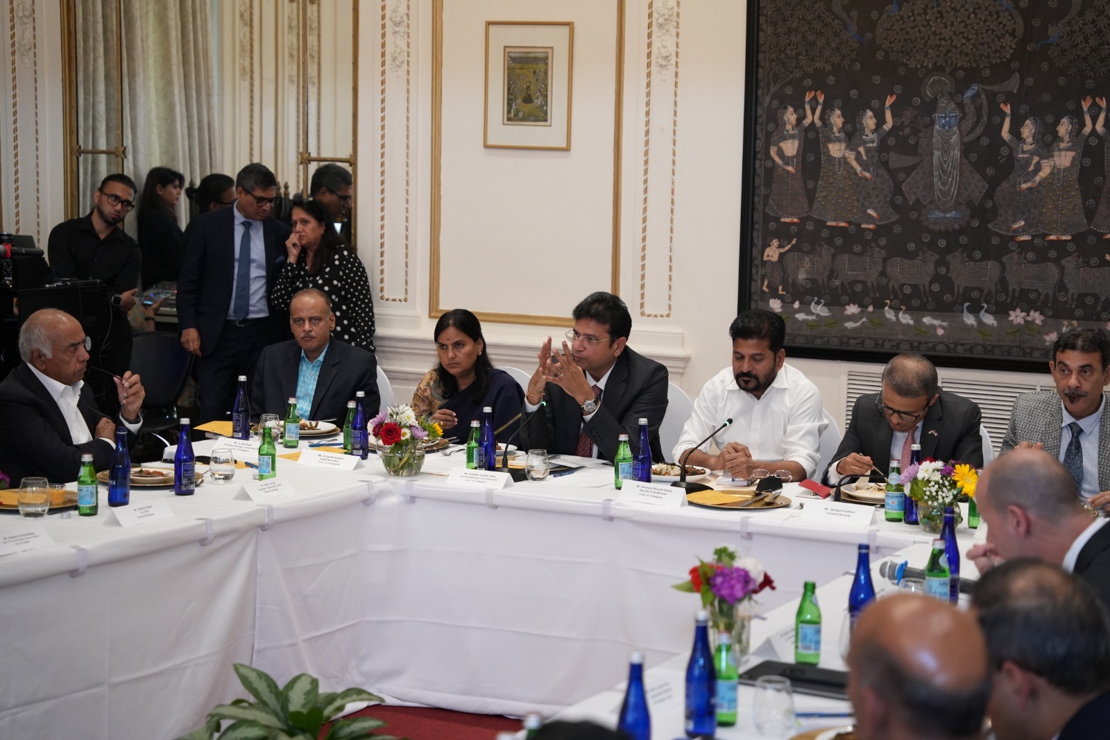 సోమవారం న్యూయార్క్ లోని కాన్సులేట్ జనరల్ ఆఫ్ ఇండియా ఆధ్వర్యంలో వర్కింగ్ లంచ్ అనంతరం ముఖ్యమంత్రి ఏ.రేవంత్ రెడ్డి వివిధ రంగాలకు చెందిన పారిశ్రామికవేత్తలతో రౌండ్టేబుల్ సమావేశమయ్యారు. ఫార్మా, ఐటీ, టెక్నాలజీ, ఈవీ, బయోటెక్, షిప్పింగ్ రంగాల్లో పేరొందిన కంపెనీలకు ప్రాతినిధ్యం వహిస్తున్నఛైర్పర్సన్లు, సీఈవోలు ఈ సమావేశంలో పాల్గొన్నారు.